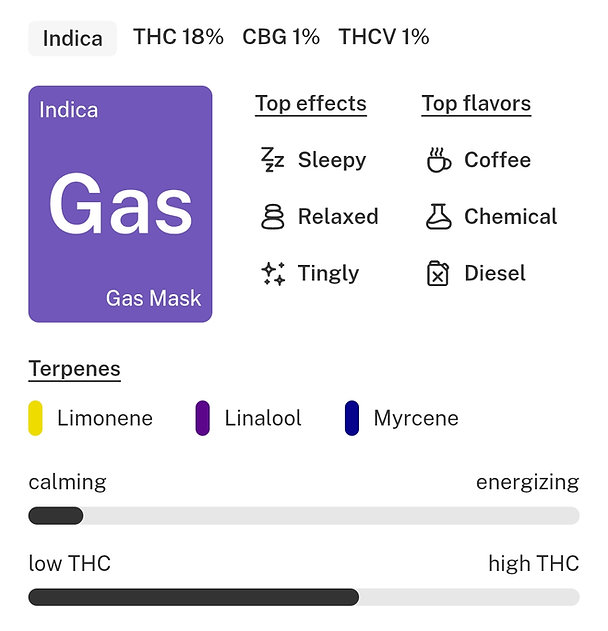 Gas Mask by Pacific NW Roots is a funky strain with an aroma so pungent, you might need a gas mask. Created by backcrossing a Cherry Pie and Alien Kush F2 hybrid, Gas Mask reeks of fuel with a distant note of overripe citrus. This strain was created through a collaboration with Exotic Genetix, a Pacific Northwest mainstay. Gasmask has an 8 to 9 week flowering period and a medium-sized yield for attentive growers. This pungent phenotype is known for its strong, long-lasting high, so mind your dosage. Anticipate a heavy, mind-numbing cerebral sensation that evaporates stress as it sinks into the limbs.