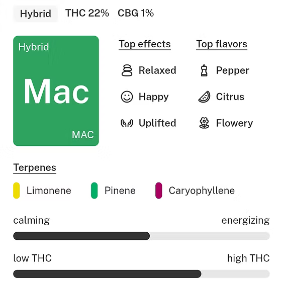 MAC donuts, is a hybrid marijuana strain made by crossing Alien Cookies with Starfighter and Columbian. MAC produces creative effects that are happy and uplifting. This strain features a smooth orange flavor that is balanced out by floral accents on a sweet, earthy finish. Growers say MAC nugs are gorgeous and covered in resin. Medical marijuana patients choose this strain to help relieve symptoms associated with stress and depression.